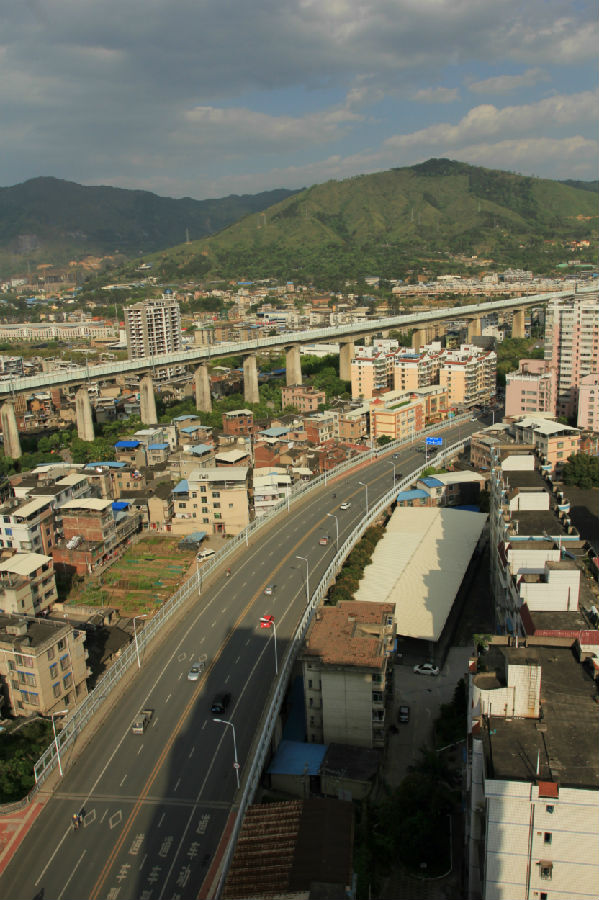 龍巖市東興高架橋位于龍巖市中心城區(qū)東北部,總投資9926萬元, 城市主干道Ⅱ級,為東興路東風(fēng)橋至南環(huán)路段,該路段長約740米,屬城市內(nèi)環(huán)線,車流量大,沿線與登高東路、鐵路、棋盤路及南環(huán)路相交,與鐵路平交處該路段高架橋上跨鐵路;在登高東路與東興路高架橋之間設(shè)置A、B、C、D匝道(均為單向單車道)利用4條匝道將既有登高東路與東興路相連,從而在東興路與登高路之間形成半苜蓿葉型互通式立交。高架橋全長461.77米,沿線與登高東路、漳龍鐵路、棋盤路及支小路相交,本工程采用高架上跨形式,跨越相交道路與鐵路,完全解決了與鐵路平交的安全隱患。橋梁上部結(jié)構(gòu)采用(18.5+20+20)m普通鋼筋砼連續(xù)梁及25m、30m預(yù)應(yīng)力砼空心板梁,橋面連續(xù),下部采用樁接立柱接蓋梁橋墩與U型橋臺,墩臺基礎(chǔ)采用鉆孔灌注樁基礎(chǔ)。