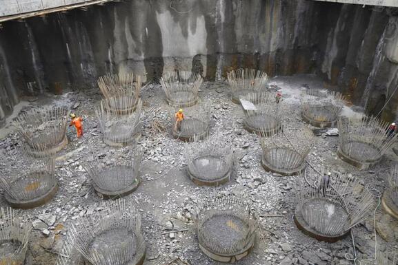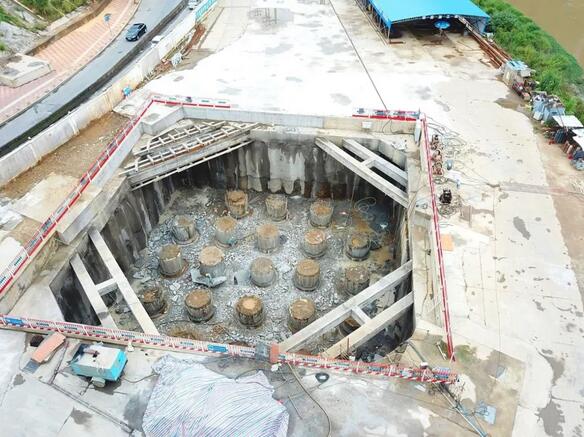 8月24日,繼龍巖大道高架橋主橋主塔樁基、承臺基坑開挖完成后,項目已進入主塔承臺施工階段,主橋封底混凝土澆筑完成0.75米(共1.5米),主橋轉(zhuǎn)體關(guān)鍵設(shè)備鑄鋼球鉸已生產(chǎn)完成,現(xiàn)場正進行樁頭破除作業(yè)。由于連續(xù)橫跨贛龍鐵路、龍廈鐵路、羅龍東路、龍津河、雙洋路,主橋采用不對稱跨塔梁同時轉(zhuǎn)體施工,其轉(zhuǎn)體總重達(dá)2.366萬噸,轉(zhuǎn)體懸臂173.75m,施工難度巨大。為避免對城市道路及鐵路運行的影響,主橋?qū)⒉捎貌粚ΨQ跨塔梁施工并分二次轉(zhuǎn)體,下一步進行控制性工程為兩次主塔轉(zhuǎn)體施工。
