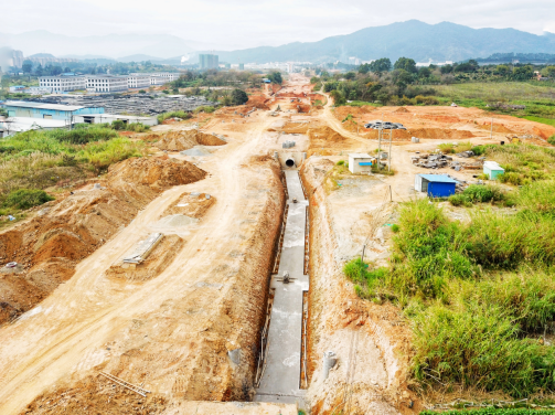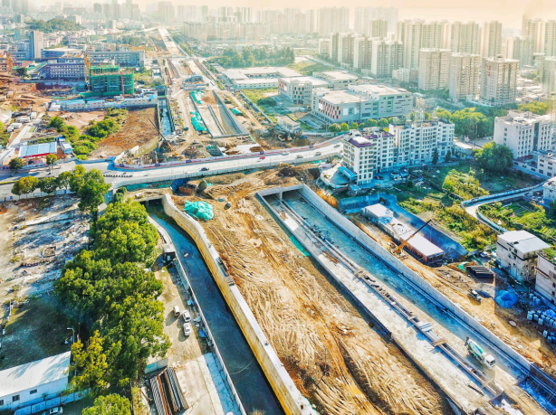 2017年9月開(kāi)工。目前,下穿車(chē)型通道U型槽、箱型通道、排洪溝主體已完成,管廊主體結(jié)構(gòu)已完成45米。