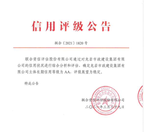 2021年3月29日,經(jīng)國內(nèi)權(quán)威評級機構(gòu)聯(lián)合資信評估有限公司評級專家集體分析、研究、決議,一致通過給予龍巖市政建設(shè)集團有限公司AA主體信用評級,評級展望穩(wěn)定。